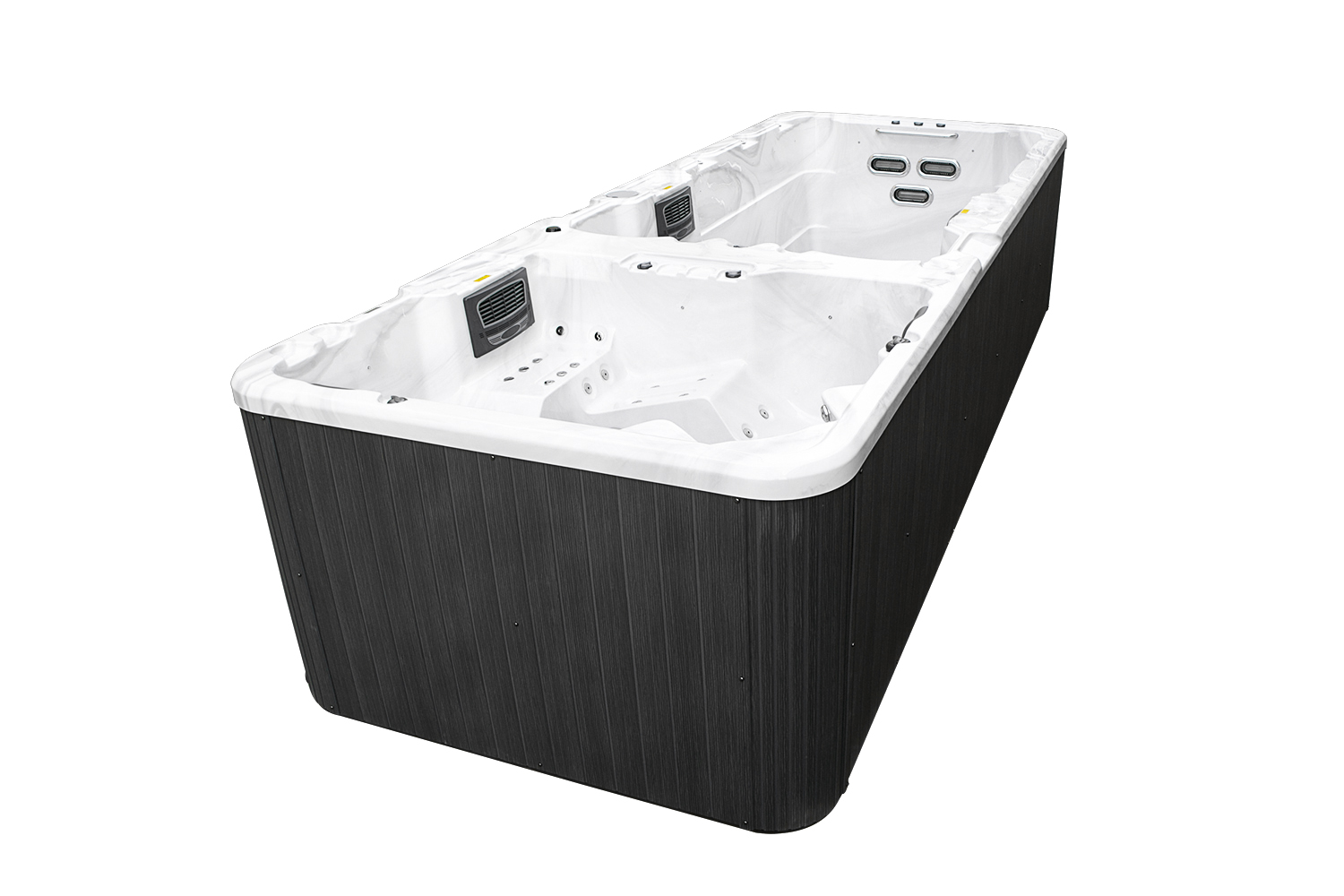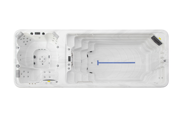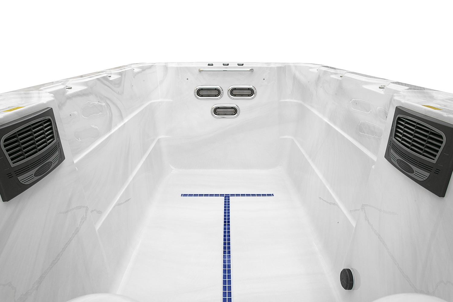 Четыре мощных насоса (два по 2,2 кВт и два по 1,5 кВт) работают независимо в разных зонах, обеспечивая интенсивный массаж с помощью 62 форсунок. Тщательно разработанная конфигурация гарантирует эффективное воздействие на все группы мышц и создает оптимальные условия для плавания.